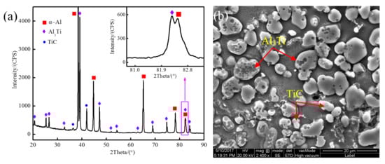 The XRD pattern and the SEM image of the Al-5Ti-0.62C master alloy are shown in Figure 3. It can be seen from Figure 3a that the main phases of the Al-5Ti-0.62C master alloy are α-Al, Al3Ti, and TiC. As shown in Figure 3b, the block-like particles with size of 5–8 μm are Al3Ti, and the little near spherical particles with size of 1–3 μm are TiC. Besides, not only the Al3Ti particles but also TiC particles are evenly distributed in the matrix, and TiC particles have not gathered together.