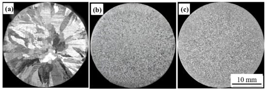 Macrostructures of A99.7 refined using the Al-5Ti-0.62C master alloy. (a) Without master alloy; (b) 0.2%; (c) 0.3%.