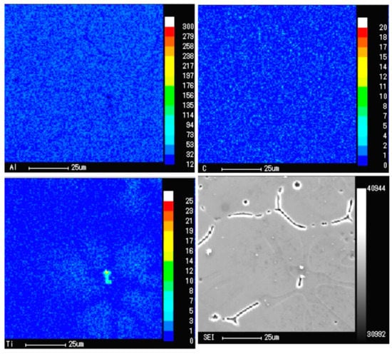 Furthermore, solid C in the Al melt also can be dissolved into C atoms and combined with Ti atoms to form TiC. Besides, solid C can react with Al to form Al4C3, and then Al4C3 will react with the Ti atom to form TiC [,], the reaction equations as follows: