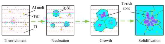 The schematic diagram of the nucleation and growth process of α-Al after adding Al-5Ti-0.62C into the melt is shown in Figure 7. In the process of solidification, TiC particles are free in the melt at first, then the excess Ti atoms segregate around TiC to form a concentration gradient. Subsequently, some TiC particles are located in the grain, then Ti atoms, which generally form into a Ti-rich zone around TiC, promote the nucleation of dendrite α-Al. After solidification, Ti elements with the lace structure are wrapped inside the grain []. Some research explained that when the concentration of Ti reaches a certain level, a thin layer of Al3Ti will be formed on the TiC surface, and Al3Ti will react with the surrounding aluminum solution to form α-Al during the solidification process. In the subsequent cooling process, the first Ti-rich α-Al formed by the peritectic reaction was surrounded by the later Ti-poor α-Al formed. The central Ti was not easy to diffuse outward, so the composition gradient of Ti was formed in the α-Al, and the contrast was formed after erosion [,].