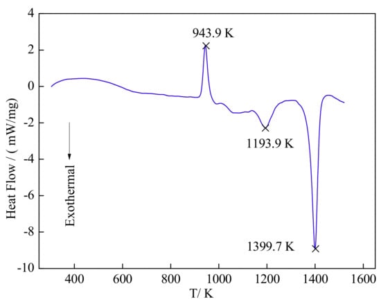 The reaction processes among Al, Ti, and C powders mixtures of the Al-5Ti-0.62C system identified by the DSC curve is shown in Figure 9. One endothermic peak and two exothermic peaks are shown in Figure 9. According to the above thermodynamic analysis and related literatures [,], and combined with the analysis of the Al-Ti binary phase diagram [] and A-Ti-C ternary phase diagram [,], the first endothermic peak characterizes the melted of Al which corresponds to Equation (3) at 943.9 K. The first exothermic peak at 1193.9 K is presented by the formation of Al3Ti and is illustrated in Equation (2), the second exothermic peak at 1399.7 K is presented by the formation of TiC and is shown in Equation (6).