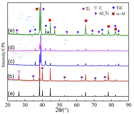 In order to study the phase transformation and microstructure transformation in the synthetic process of Al-5Ti-0.62C, the Al-5Ti-0.62C preform block was prepared and the microstructure under different reaction times in the melt was investigated. The XRD patterns of the quenched samples at different times are shown in Figure 10. It can be seen from Figure 10a,b that the main phases of the preform are α-Al, Ti, and C at the initial stage (20 s and 45 s). When the reaction time is 60 s, Al3Ti and TiC phases were detected by XRD as shown in Figure 10c. Furthermore, when the reaction time increases, the diffraction peaks intensity of Al3Ti and TiC phases gradually increase, as shown in Figure 10c–e.