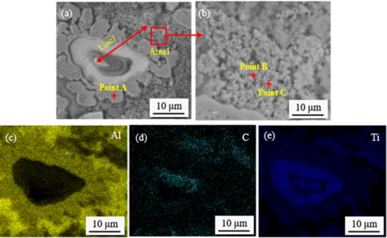 SEM images and map scan patterns of the quenched sample at 120 s: (a) SEM image; (b) SEM image of Area 1; (c–e) map scan patterns of Al, C, and Ti, respectively.