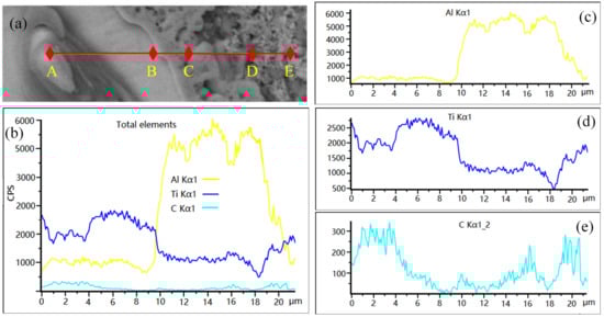 SEM image and line scan patterns of Line 1 of Figure 11a: (a) SEM image; (b) line scan patterns of all elements; (c–e) line scan patterns of Al, Ti, and C, respectively.