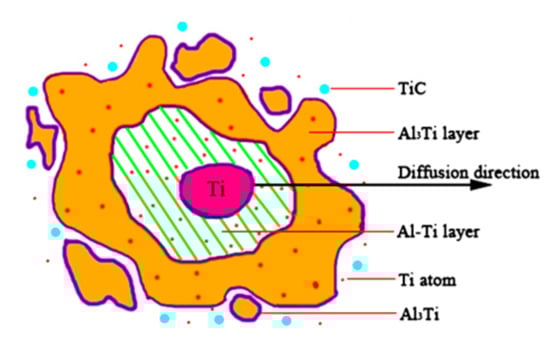 The lace structure model of the Al-5Ti-0.62C system is shown in Figure 13. An amount of research reports that the wettability of Al and Ti is much higher than that of Al and C, therefore, liquid Al will rapidly spread on the surface of Ti particles after Al particles have melted, because the solubility of titanium in aluminum is very small, so it is rapidly saturated at the interface of the Al-Ti layer. Then, with the reaction of Al and Ti, the Al3Ti nucleus grows up to form Al3Ti particles. Moreover, because of the brittleness of Al3Ti, it is separated from the Al-Ti interface and entered into the Al solution under the continuous impact of liquid aluminum. Next, liquid aluminum flows into the gap of Al3Ti after separation, and continues to react with Ti to form Al3Ti, subsequently, Al3Ti breaks away from the Al-Ti interface and enters into the Al solution, and promotes the front Al3Ti particles to float away from the interface. In addition, the formation of Al3Ti will release a lot of heat, which will increase the local temperature to about 1600 K. Nevertheless, the melting point of Al3Ti is 1613 K, hence that it will cause the Al3Ti to fuse and break away from the Al-Ti layer. So, over and over again, until enough Al3Ti particles are distributed near the interface, the flow of liquid aluminum is blocked and the impact force is not enough to separate the Al3Ti particles from the titanium base wall. Subsequently, Al3Ti or Ti atoms provided by the Al3Ti diffusion reaction with the solid C form TiC particles.