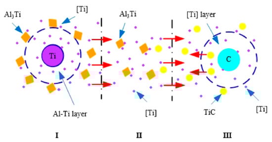 The micro-kinetic model of TiC synthesis of the Al-5Ti-0.62C system is established by the analysis of the thermodynamic analysis of the Al-5Ti-0.62C system as shown in Figure 14. The TiC synthesis can be divided into three micro domains in the micro-region: the first micro-region is the generation of Al3Ti particles. When the preform block is put into the aluminum melt, the liquid aluminum in the aluminum melt penetrates into the preform block, so that the internal temperature of the prefabricated block is increased, afterwards, the aluminum powder is melted, and then the aluminum powder is wrapped on the surface of the Ti particles, hence, the Al-Ti layer is formed around the Ti particles by virtue of the solid–liquid diffusion, so the reaction I takes place. The second micro region is the dissolution of Al3Ti particles. As the reaction I is an exothermic reaction, the Al3Ti particles are separated from the Al-Ti layer as the reaction proceeds, and the Al3Ti particles undergo a dissolution reaction II under the action of high temperature, and the generated Ti is migrated to the third micro-region, and the generation of the TiC particles is provided [Ti]. The third micro-region is mainly the formation of TiC particles. The [Ti] of the second micro-region forms a titanium-rich layer around the C-particles, and the solid-state carbon reacts with Ti atoms provided the dissolved Al3Ti generates TiC particles. As the reaction proceeds, TiC is separated from the titanium-rich layer and free in the melt.
