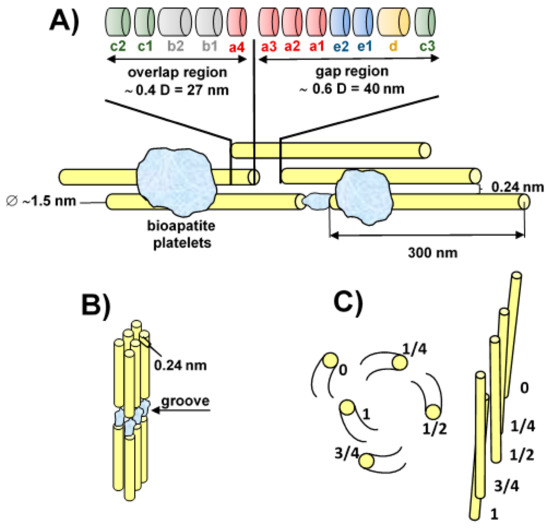 Collagen (COL) comprises two α1(I) chains and one α2(I) chain. The repetitive nature of the amino acid (AA) sequences of COL, which consists of –[Gly (glycine)-X-Y-]n where X and Y are frequently proline (Pro) and hydroxyproline (Hyp) residues, allows the individual α chains to assemble into triple helical structures referred to as tropocollagen molecules with diameters of ~1.5 nm. Collagen triple helices are stabilised via intramolecular hydrogen bonding. A 40 nm gap exists between the C and N termini of collinear tropocollagen molecules together with an adjacent 27 nm overlap zone, which are spaced every 67 nm along the fibrils, the so-called D-period (Figure 1A), which comprises 12 bands marked a3, a2, a1, e2, e1, d, and c3 (within the hole zone) and c2, c1, b2, b1, and a4 (within the overlap zone) [12]. They contain a series of charged amino acids (AAs), which are open so as to provide potential binding sites for the calcium and phosphate ions involved in the mineralisation process. COL gap zones have been considered to provide critical spaces for the mineralisation process. They appear to constitute early stage of bioapatite (BAP) nucleation sites and extend into the overlap zones during the later stages of intrafibrillar mineralisation [30]. Gaps (each with a thickness of ~1.5 nm) form a zone that can be traced across each fibril; the gaps are aligned so as to form grooves (Figure 1B). However, in reality, COL molecules are not rod-like but are right-handedly helically twisted in a discontinuous manner along their lengths and are bound together at specific locations to form microfibrils, which can be defined as an assembly of five individual COL molecules arranged in parallel and quarter-staggered along their axial direction (Figure 1C).