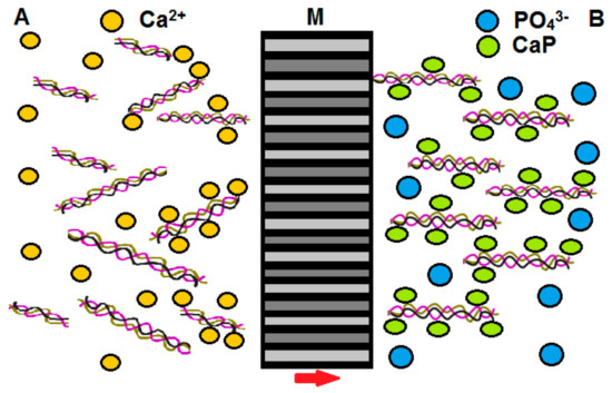 In some cases, special additional procedures have been applied to simple CaP precipitation. Tomomatsu et al. [63] employed enzymatic mineralisation with an alkaline phosphatase (ALP) to catalyse the hydrolysis of water-soluble phosphate esters in the presence of Ca2+ ions. ALP is prone to acting on organic phosphates so as to generate phosphate ions, which are subsequently able to react with Ca2+ ions arranged in an orderly way on COL molecules. Wang and Liu [62] applied the microwave irradiation process during precipitation whereupon the reaction between the Ca2+ and PO43− ions accelerated significantly accompanied by a reduction in the particle size. Maas et al. [89] presented a particularly interesting method for the preparation of mineralised COL fibrils (Figure 2) based on a nanoporous polycarbonate track-etched membrane (M) that separated two liquids, i.e., a feed solution (A-containing both Ca2+ cations and monomolecular tropocollagen) and a receiver solution (B-containing PO43− anions leading to the formation of mineralised nanofibres at the exit of the pores). While this approach had been used previously for the preparation of nanoparticles, Maas et al. expanded the method so as to produce fibrils accompanied by the control of the size of the nanofibre diameters.