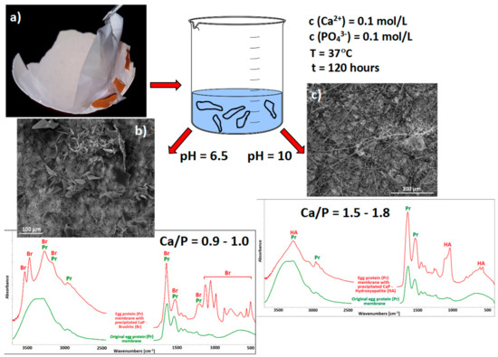 (a) Eggshell biomembrane used as a template for CaP precipitation under physiological conditions applying two different pH values. SEM and FTIR analysis (b) for pH = 6.5 and (c) for pH = 10. Pr = protein; HA = hydroxyapatite; Br = brushite.