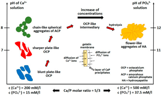 The formation of various CaP aggregates in GEL as a template by means of varying pH values and the concentrations of source ions, according to Teng et al. [201].