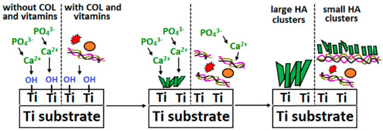 Comparison of the formation of various CaP aggregates and clusters on a Ti surface without and with modification via COL and vitamins as templates, according to Ciobanu and Ciobanu [222].
