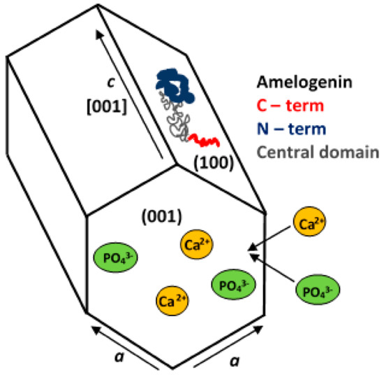 Besides the proteins, it is suggested that complexing effect of organic molecules, such as AAs and chelating reagents, with Ca2+, can modulate the size of CaPs. Steric structure of template is believed to play one of an important role in shape and size of CaP precipitates. Fibrous templates can lead to a more needle-like CaP, while globose templates, result in sheet-like CaP, as mentioned in Section 3.1.1. Compared with a linear structure, branched molecules and dendrimers can apparently decrease the crystal size, since CaP nucleation and crystallization may be localized in the exterior or interior of branched molecules. It is generally assumed that proteins regulate solution crystal growth via some sort of ‘epitaxial’ relationship between specific crystallographic faces and specific protein conformers. Amelogenin (AMEL) a protein for the control of the initiation, nucleation orientation, and growth of HA crystals in tooth enamel, can be mentioned such as an illustrative example. It was found that the strong interaction of AMEL with the (010) face of the OCP crystal, inhibits its growth in the b-axial