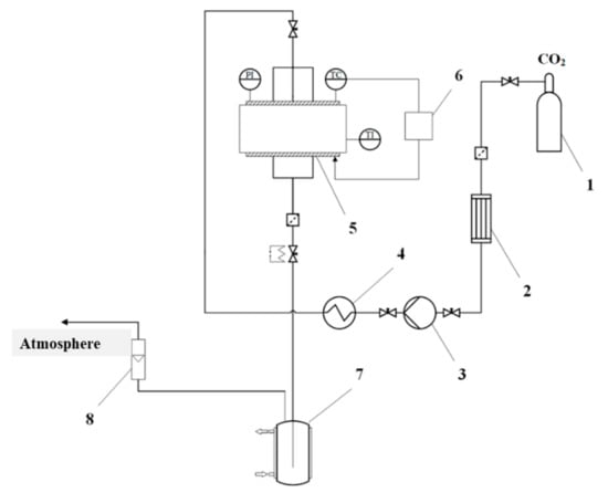 Scheme of the supercritical reactor. 1—CO2 tank, 2—condenser, 3—piston pump, 4—heater, 5—high pressure reactor, 6—thermal control system, 7—separator, 8—rotameter, PI—manometer, TC—temperature probe, TI—temperature probe.