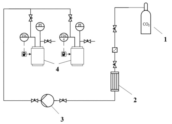 Scheme of the installation for supercritical adsorption: 1—CO2 tank, 2—heat exchanger, 3—liquid diaphragm pump, 4—high pressure reactors with heating jacket, PI—manometers, TIC—temperature controller with operator panel.