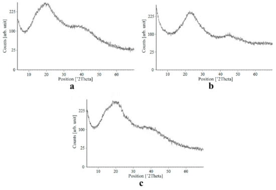 X-ray diffraction patterns of ketoprofen loaded into the alginate-based aerogel: (a) 18.05, (b) 19.36, (c) 26.98 wt%.