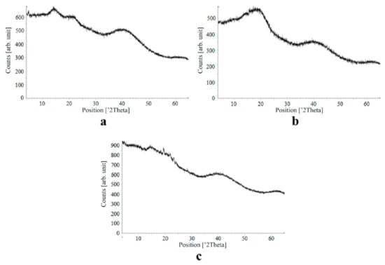 On X-ray diffraction patterns for all obtained drug-loaded alginate-based aerogel particles with different amounts of a certain active substance, there are no distinct peaks corresponding to the crystalline state of the substance. The resulting X-ray diffraction patterns can be seen as noise track, the occurrence of which is explained by the unevenness of the process of emission of quanta by X-ray tube or intrinsic noise of the detector. The final X-ray diffraction pattern for each sample was obtained by overlaying several diffraction patterns (for each sample, the experiment was repeated). The results of the qualitative X-ray analysis suggest that the drugs loaded into the alginate-based aerogel particles are mainly in the amorphous state.