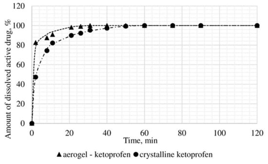 In vitro dissolution tests were performed for the obtained drug-loaded aerogels. The dependence «concentration of released drug vs time» was determined. Obtained results showed that release rate increased for ketoprofen, nimesulide, and loratadine loaded aerogels, respectively. Comparison of the release profiles of compositions with the release profiles of similar pure substances showed a reduction in the release time of 50% (T1/2) of the active substance up to 6.6 times. This suggests that the supercritical adsorption of active substances into the aerogels makes it possible to obtain pharmaceutical forms of drugs in a stable amorphous state with improved pharmacokinetic properties.