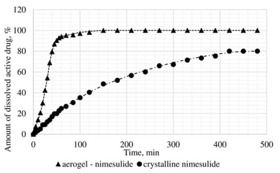 The dependence «concentration of released drug vs. time» was determined for certain drug-loaded aerogel. Moreover, it was determined that time was required to release 50% of the active drug from aerogel. The obtained data was compared with the same data for certain drug in crystalline form. After that was calculated, a reduction of time was required to release 50% of the active drug.