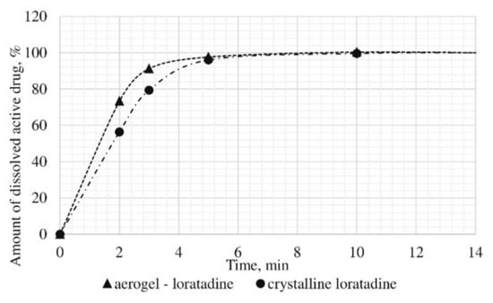 A reduction of time for all investigated drug-loaded aerogels was measured. This time is required to release and dissolve 50% of model active substance (T1/2). When compared to T1/2 for drug loaded into aerogel with T1/2 for pure drug (Table 4), it could be observed that release of the aerogel-loaded drug is faster, and that this drug goes faster into the solution.