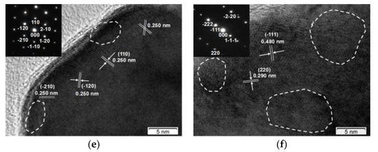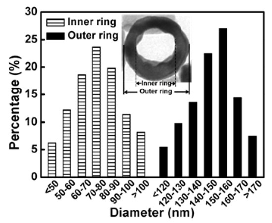 The inner ring average diameter of the Fe3O4-MNRs was determined to be about 75.2 nm. The outer ring average diameter of the Fe3O4-MNRs was determined to be about 155.6 nm (Figure 2, n = 300). The thickness of ring wall should be about 40.2 nm. Meanwhile, the average crystallite size can be computed by Scherrer equation; the correlation calculation results were listed in Table S1; the crystallite sizes of the Fe3O4-MNRs were about 22 to 35 nm, which were near to the result of TEM. Furthermore, the average diameter of the type I and type II Fe3O4 nanoparticles were determined to be about 337.49 (n = 300, Figure S1c) and 196.52 nm (n = 300, Figure S1d), respectively.