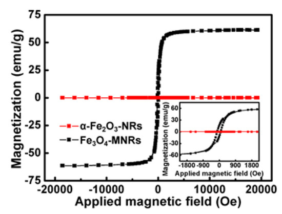The hysteresis loops of the as-prepared α-Fe2O3-NRs and Fe3O4-MNRs were recorded at room temperature (Figure 3). The saturation magnetization of the material was about 62.4 emu/g, which showed that the Fe3O4-MNRs emerged good magnetic properties and can be easily separated from the solution with an external magnet.