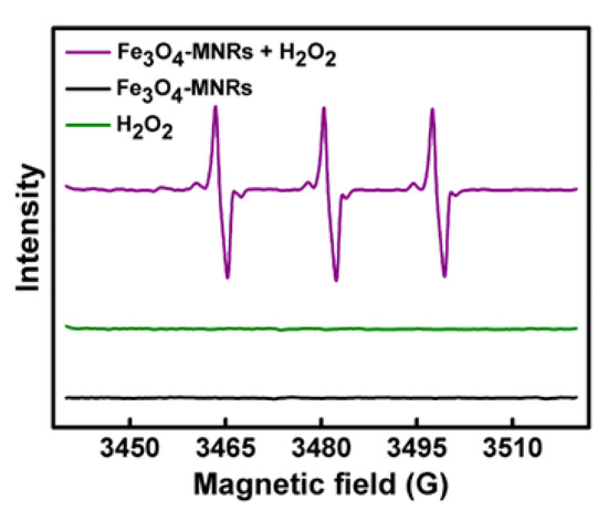 The amount of •OH was determined by using DMPO, which is the •OH specific spin-trapping agent. Accordingly, the Fe3O4-MNRs promoted the production of free radical •OH with the assistance of H2O2; in contrast, the radicals signal was not obvious in H2O2 or Fe3O4-MNRs group alone (Figure 6). The results indicated that the Fe3O4-MNRs could generate •OH effectively, which was ascribed to the Fenton-like effect between the iron ions (release from Fe3O4-MNRs) and H2O2. Then the produced •OH could be used for the subsequent dye decoloration treatment [35].
