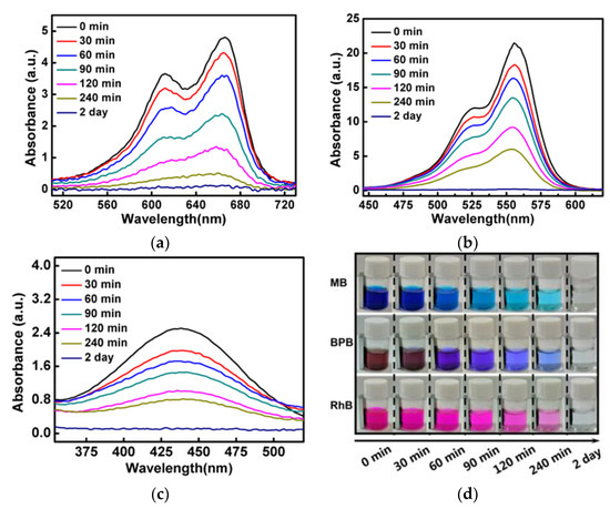 UV-vis curves of MB (a), RhB (b), and BPB (c) solution treated with Fe3O4-MNRs in different periods. (d) Color changing photographs of the dye solution.