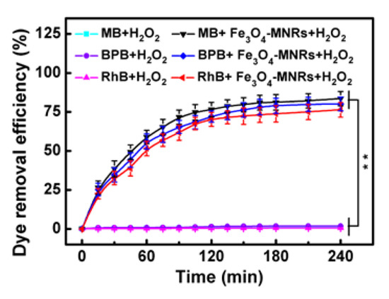 Typically, Fe3O4-MNRs (6.0 mg) was firstly dispersed into three dyes (MB, BPB, and RhB) solution (0.2 mg∙mL−1, 1.0 mL) containing 1.0 mL H2O2 at room temperature. Then, 1 µL sample was drawn by a sampler and measured in time course by monitoring the absorbance change at 554 nm for RhB, 665 nm for MB, and 440 nm for BPB with a UV-vis spectrophotometer, respectively. The amount of samples was so small that it could be negligibly compared to the experimental sample. Meanwhile, blank measurements were taken under the same operated condition but without addition of Fe3O4-MNRs.