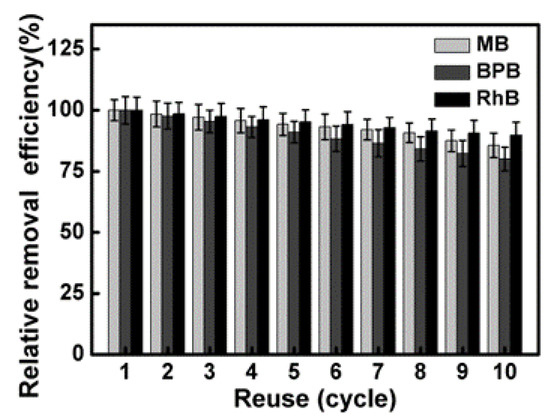 To confirm the Fe3O4-MNRs could degrade wastewater efficiently, we performed the experiments of dye decoloration at different treatment conditions, such as pH, temperature, and initial dye concentration. Briefly, the degradation efficiency of Fe3O4-MNRs demonstrated a pH dependence from 3.0 to 11.0; the maximum catalytic efficiency occurred around pH 4.0–6.0 (Figure S4); this phenomenon was related to the fact that the iron metallic ion leaches in acid pH value more effectively. The temperature-dependent performances were also researched over increasing temperatures from 4 to 60 °C, the Fe3O4-MNRs showed excellent removal efficiency (above 70%) at different temperature ranges (Figure S5). The initial concentration of dyes highly affected the removal efficiency. Around 90% of dyes were degraded by Fe3O4-MNRs at low concentrations of 0.1 mg∙mL−1, in comparison with around 70% removal efficiency for a high concentration of 1.0 mg∙mL−1 (Figure S6). This result could be interpreted as follows: The dye removal capacity shows a concentration-dependent behavior.