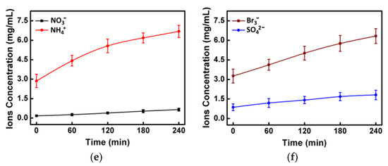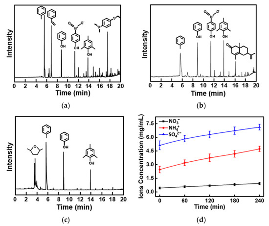 In order to confirm the process of dyes oxidized degradation, the degradation process was monitored by a GC-MS method. Typically, after 60 min degradation period, for the MB solution, some small organic molecules such as methylbenzene, styrene, phenol, p-nitrophenol, trimethylphenol, and 4-Aminothiophenol, N,N,S-trimethyl could be detected (Figure 10a). For the RhB solution, small organic molecules such as methylbenzene, phenol, p-nitrophenol, and trimethylphenol could be detected (Figure 10b). For the BPB solution, some small organic molecules such as tetrahydro-2,5-dimethyl, methylbenzene, phenol, and trimethylphenol could be detected (Figure 10c). The kinetics of dyes disappearance are given in Figure S8. It can be seen that the quantities of dye degradation increased with time. During the 240 min degradation process, the organic molecules were degraded as CO2 (Figure S9) and inorganic ions (Figure 10d–f). For the MB solution, the final ionic products are SO42−, NH4+, and NO3−, respectively. For the RhB solution, the final ionic products are NH4+ and NO3−. For the BPB solution, the final ionic products are Br− and SO42−. Accordingly, the dyes were degraded.