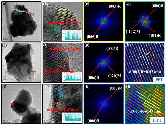 TEM and HRTEM images: (a,b) SLC; (e,f) SLS; (i,j) OCP; (c,d) fast Fourier transform (FFT) of the corresponding area in (b); (g,h) FFT and inverse fast Fourier transform (IFFT) of the corresponding area in (f); (k,l) FFT and IFFT of the corresponding area in (j). The indexes marked by R and M are related to the rhombohedral (Rm) phase and monoclinic Li2MnO3 (C2/m) phase.