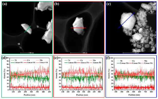 To further understand the effect of preparation methods on crystal microstructure, the microscopic morphology of the samples SLC, SLS, and OCP are shown in Figure 3. Figure 3a,e,i shows TEM images of SLC, SLS, and OCP samples, respectively, and the particle size is consistent with that of the SEM image. Figure 3b,f,j shows the HRTEM images of the corresponding area in Figure 3a,e,i. There is a clear lattice fringe in the “c” region of Figure 3b with interplanar spacing of 0.477 nm, corresponding to the (003) plane of the layered phase. These corresponding diffraction points of the (003) and (006) panel can be found in Figure 3c of its fast Fourier transform (FFT). The FFT of the “d” region in Figure 3b is shown in Figure 3d, and there are diffraction points of the α-NaFeO2 layered structure of the space group Rm and the monoclinic system of the space group C2/m. Figure 3f shows very clear lattice fringes with a lattice spacing of 0.474 nm and 0.236 nm, corresponding to the (003) and (006) plane of the α-NaFeO2 layered structure, respectively. The FFT pattern and inverse fast Fourier transform (IFFT) pattern of the “g” region are shown in Figure 3g,h. The lattice spacing measured in Figure 3j is 0.478 nm, corresponding to the (003) plane in the layered structure. Figure 3k,l shows the FFT pattern and IFFT pattern of the “k” region, respectively. These isolated two sets of lattice pattern of LiMO2 and Li2MnO3 indicate lithium-rich layered oxides have composite structure in SLC and SLS samples, while the only one set of lattice pattern gives proof of solid solution in the OCP sample. Moreover, for OCP samples, the (003) plane has been significantly expanded compared to the other two samples, and it helps to improve the rate capacity of lithium-rich layered oxides. X-ray line scan element distribution (EDX) maps of SLC, SLS, and OCP samples are shown in Figure 4. The results show that the elements of OCP are uniformly distributed, and no nickel segregation occurs [36,42]. Evenly distributed transition metal elements help to enhance the stability of the layered structure and suppress capacity and voltage decay [21,36].