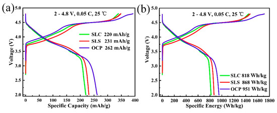 The initial charge and discharge curves for all samples between 2.0 and 4.8 V at the current rate of 0.05 C are shown in Figure 5a. It shows similar initial charge and discharge curves, which is consistent with the characteristic curve of the lithium-rich layered oxide. The charging curve can be divided into an “S” zone below 4.5 V and an “L” zone above 4.5 V. The “S” region corresponds to the oxidation of the transition metal in the LiNi0.8Co0.1Mn0.1O2 component, and the “L” region corresponds to the Li and O removed from the crystal structure in the form of “Li2O” [25]. As shown in Figure 5a, the initial discharge specific capacity of LL-811 prepared by the co-precipitation method is 262 mAh·g−1, which is much higher than that of the SLC (220 mAh·g−1) and SLS (231 mAh·g−1) prepared by the sol–gel method. From the charging curve, the OCP sample has a longer 4.5 V platform compared to the SLC and SLS samples, which indicates that more non-electrochemically active Li2MnO3 is activated. According to the analysis of the TEM image (Figure 3), compared with the two-phase composite structure of SLC and SLS, the solid solution structure of OCP may be favorable for activating Li2MnO3. Figure 5b shows the initial charge–discharge curve of specific energy. OCP has the highest specific capacity, which is attributed to the fact that the lithium-rich layered oxide prepared by the oxalate co-precipitation method has smaller primary particles, and the secondary particles have a porous spherical morphology, which can shorten the diffusion pathway of Li+ ions.