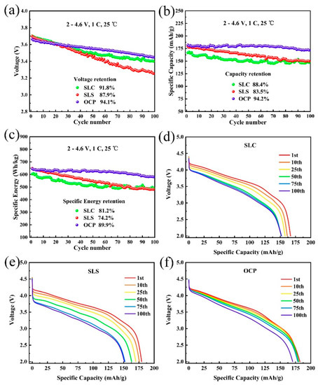 Figure 6 shows the voltage and capacity decay of all samples between 2.0–4.6 V at a current rate of 1 C. As can be seen from Figure 6a, after 100 cycles, the discharge median voltage decay of OCP is 210 mV and the retention reaches 94.1%, which is higher than 91.8% of SLC and 87.9% of SLS, and the voltage decay is obviously suppressed. Figure 6b shows the specific capacity decay of the lithium-rich layered oxide cathode material. It can be seen that after 100 cycles, the specific capacity retention of OCP is 94.2%, which is significantly higher than 88.4% of SLC and 83.5% of SLS. By comparing the discharge specific energy of all samples, the results in Figure 6c are similar to those in Figure 6b. The discharge specific energy of OCP retention is 89.9%, while the SLC and SLS are only 81.2% and 74.2%, respectively. Figure 6d–f shows the discharge curves of SLC, SLS, and OCP at different cycle times. In the first 75 cycles, the specific capacities of the SLC and SLS were decayed from 166.9 mAh·g−1 to 152.1 mAh·g−1 and 179.5 mAh·g−1 to 152.2 mAh·g−1, respectively. However, the specific capacity of OCP was only decayed from 182.3 mAh·g−1 to 178.7 mAh·g−1, and the capacity decay is much smaller than SLC and SLS. For the discharge median voltage, the decay of OCP is also significantly suppressed. OCP has a lowest voltage decay and a larger specific capacity after 75 cycles, indicating that its layered structure is more stable. The voltage and capacity decay of the OCP samples was suppressed, which can be attributed to the high nickel content, uniform element distribution, and stable layered structure [25,26,36]. In addition, the secondary particle structure is tight, and the presence of pores on the surface is also the reason for the best electrochemical performance of OCP.