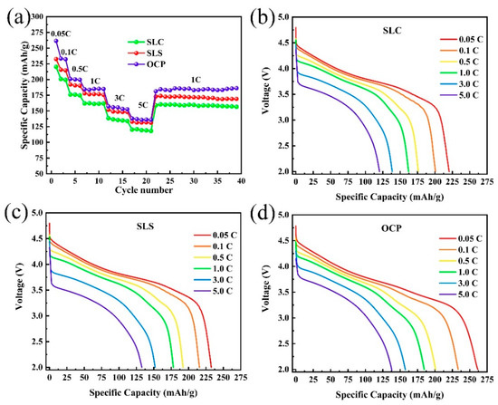 To further understand the effect of the preparation method on the rate capability, the rate capability of SLC, SLS, and OCP is shown in Figure 7. The samples prepared by oxalate co-precipitation show higher discharge capacity at various rates. The specific capacities of OCP are 261.6, 233.4, 200.9, 184.6, 157.4, and 138.0 mAh·g−1 at the discharge rates of 0.05, 0.1, 0.5, 1, 3, and 5 C, respectively. This indicates that increasing the spacing of the (003) plane, increasing the contact area of the electrolyte with the positive electrode material, and shortening the lithium ion diffusion path can increase the rate capacity of the lithium-rich layered oxide. In addition, the solid solution structure may also help increase the specific capacity of lithium-rich layered oxides. Figure 7b,c shows the discharge curves of SLC, SLS, and OCP at different discharge rates. As the rates increase, the discharge capacity and voltage of all samples have different degrees of decay. The results show that when the battery is discharged at a higher current density, the electrode resistance increases significantly, and the discharge energy is greatly reduced, which seriously affects the application of the lithium-rich layered oxide positive electrode material in electric vehicles. Although the OCP sample has the highest specific capacity under different current densities, its specific capacity has a greater decay at large current densities, resulting in a lower rate capacity retention than the SLS sample.