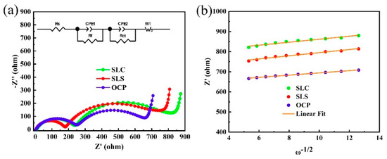 In order to understand the influence of the preparation method on the interfacial electrochemical and reaction kinetics of LL-811, the electrochemical impedance spectroscopy (EIS) of LL-811 prepared by different preparation methods were investigated. The Nyquist plots of SLC, SLS, and OCP are shown in Figure 8a. The impedance spectrum was fitted using the embedded equivalent circuit in Figure 8a, and the fitting results are shown in Table 2. The results show that the SLS has the smallest Rf and OCP has the smallest charge-transfer resistance (Rct). Figure 8b shows the linear relationship between Z′ and ω−1/2, and the slope obtained by linear fitting represents the value of σ. The lithium ion diffusion coefficients calculated by the formula are shown in Table 2 [43]. The lithium ion diffusion coefficient of OCP is 3.67 × 10−13 cm2·s−1, which is higher than 2.04 × 10−13 cm2·s−1 of SLC and 1.86 × 10−13 cm2·s−1 of SLS. This proves that the lithium-rich layered oxide prepared by the oxalic acid co-precipitation method has a faster migration rate of lithium ions, and the rate performance is excellent in comparison.