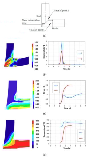 Result of FEM simulation: (a) Paths of the points under examination; (b) Strain rate distribution [s−1] and time trace of strain rate for points 1 and 2; (c) true strain distribution [-] and time relation of true strain for points 1 and 2; (d) temperature distribution over time for tracking points dependences of temperature for points 1 and 2.