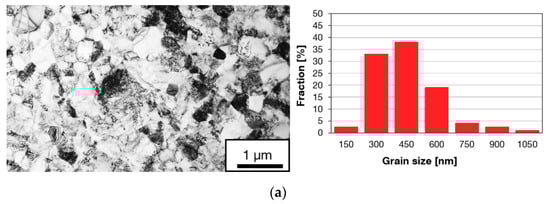 For the purpose of observation in the transmission electron microscope (TEM), thin foils were prepared with final electrolytic thinning in a Tenupol 5 device, using a solution of 300 mL CH3OH + 175 mL 2-butanol + 30 mL HClO4 at a temperature of −10 °C and a voltage of 40 V. The TEM analysis was performed in a JEOL 200CX (JOEL, Tokyo, Japan) instrument with an acceleration voltage of 200 kV. Selective electron diffraction was used for phase identification. Grain size was measured using the linear intercept method. The sampling was carried out in the transverse direction.
