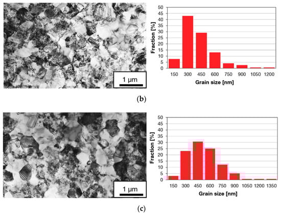 Figure 4 presents substructures of the material after various numbers of passes through the Conform SPD machine. Each micrograph is accompanied by a histogram of grain size distribution. The most notable refinement occurred during the first pass through the Conform SPD machine. The resultant grain size was approximately 374 nm (Figure 4a). Most grains were polyhedral but some regions contained acicular grains (centres of micrographs in Figure 4). There were some occasional grains whose size exceeded 1 μm, as indicated by the histograms. Dislocation density was very non-uniform. In some regions, there were grains with very low dislocation densities, in others, grains with high dislocation densities. No deformation twins were found, which, at this strain magnitude, is consistent with the findings in []. The non-uniform substructure can be seen after the Conform SPD processing, after one or more passes. Subsequent passes did not lead to further refinement of the substructure (Figure 4b,c). The number of grains with a grain size of 700–900 nm increased after the third pass through the Conform SPD machine (Figure 4c). The relationship between the grain size and the number of extrusion passes is plotted in Figure 5 for the transverse and longitudinal directions. In Figure 5, an increase in the grain size can be seen after the third and fourth passes through the Conform SPD machine.