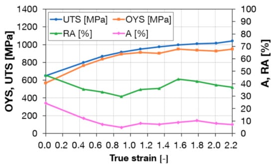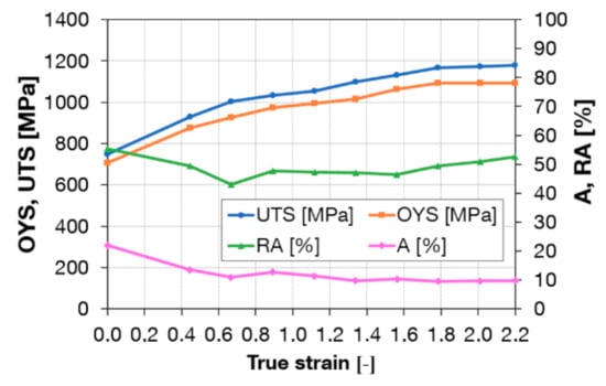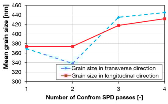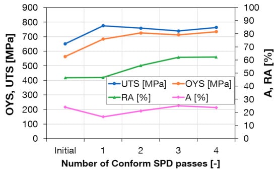 Figure 9 is a plot of mechanical properties vs. number of passes through the Conform SPD machine. Work-hardening was most intensive in the first pass. Ultimate strength increased from 651 MPa to 777 MPa. This is in good agreement with the change of grain size values after the first pass according to Hall–Petch strengthening. Further passes did not lead to an increase in strength. Figure 9 indicates that the processing has not reduced elongation. The RA even increased slightly. Hence, Conform SPD processing did not decrease material ductility.