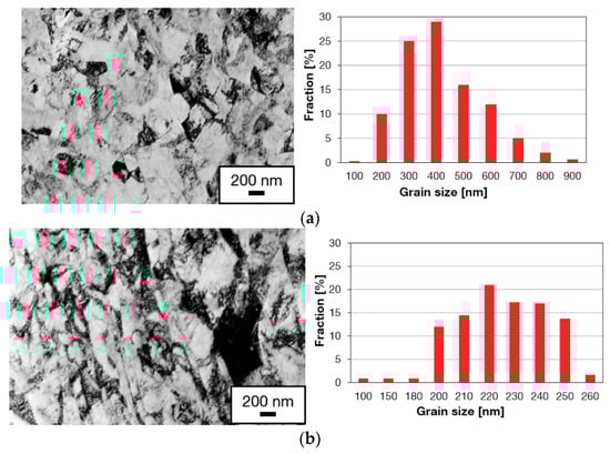 Figure 6 presents the substructures after three passes through the Conform SPD machine and rotary swaging (true strain 0.9%–60% reduction of the cross-sectional area). Figure 6a shows the substructure in the transverse direction, in which equiaxed polyhedral grains dominate. The mean grain size in the transverse direction was 370 nm. Figure 6b shows the substructure in the longitudinal direction. It contains elongated grains. The related histogram shows the width of the elongated grains. As the diffraction spectra obtained from these samples contain more intensive diffraction lines for the {100} planes than those from the region of polyhedral equiaxed grains, one can assume that the preferential grain orientation is associated with these planes (Figure 7). It is a basal texture which is characteristic of pure titanium after conventional cold forming []. Whereas rotary swaging has not led to further refinement, it produced higher dislocation densities, strong texture and elongated grains. These are characteristic features of work hardening [].