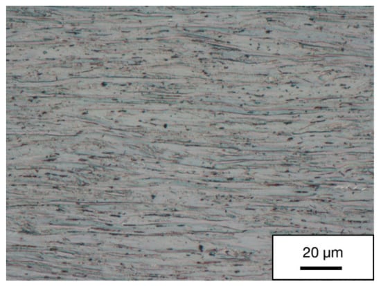 To compare, Figure 8 depicts the microstructure of the material after plain rotary swaging (reduction of area −90%) for comparison with the microstructure achieved after processing by combination of Conform SPD and rotary swaging presented in Figure 6b. The purpose was to examine the effect of an added SPD process on the microstructure characteristics. The photograph shows that the initial grains became significantly elongated. The grain size in the longitudinal direction was much larger.