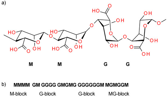 Alginate is a naturally occurring polysaccharide composed of (1→4) linked β-D-mannuronic acid (M) and its C-5 epimer α-l guluronic acid (G). It consists of a mixture of GG, MG, and MM blocks, arranged in an irregular blockwise pattern that determines their properties [1] (Figure 1). Due to the abundance of algae in water reservoirs, they are a predominant form of biomass. Their content in biomass is estimated at up to 40% of dry weight. The global production of alginate is 50,000 tons per year. Almost 30% of this is used by the food industry, while the remainder is employed in industrial, pharmaceutical, biotechnological, and dental applications [2].