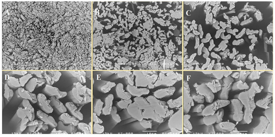 SEM images. Transverse view of copper alginate fibers at magnifications: (A) 100×, (B) 500×, (C) 1000×, (D–F) 2000×.