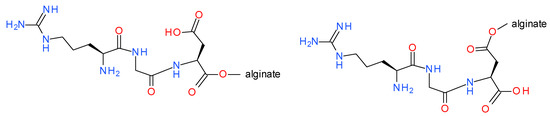 The most important requirement for the use of alginates as a biomaterial is their ability to provide a physically and chemically favorable environment for living cells [12]. Alginates have many advantages as biomaterials, including hydrophilicity, biocompatibility, and lack of immunogenicity [13]. The susceptibility of alginates to form gels capable of encapsulating cells, drugs, and other active biological compounds is another important property. However, an important disadvantage is that alginates are not cell adhesive [14]. For this reason, chemical functionalization with cell signaling compounds or adhesion enhancing compounds is crucial to overcome the low affinity of alginates towards cells. In addition to enhancing cellular interactions, functionalization can also play a role in controlling cell growth, differentiation, and behavior. The extensive use of RGD peptides to modulate the properties of alginate-based materials is due to the fact that these derivatives are by far the most effective peptide compound stimulating cell adhesion. The RGD sequence is a structural motif characteristic of many proteins in living organisms, which activates the adhesion of more than one type of cell. It does this by acting on more than one type of receptor, stimulating adhesion and improving cell survival. In multicellular organisms, cell–cell interactions and cell–extracellular matrix (ECM) interactions occur via adhesion receptors. In the group of cell adhesion receptors, the main role is played by various integrins. More than half of the 24 known integrins bind ECM proteins containing the RGD motif. Given that integrin-modulated adhesion affects the regulation of many physiological processes [15] (cell migration, proliferation, survival, apoptosis) as well as pathological processes (e.g., tumor invasion, metastasis), learning about the ligands that are selective and specific for these receptors is crucial to the rational design of materials for regenerative medicine [16,17,18,19,20]. Selective integrin ligands are used as inhibitors of tumor cell angiogenesis, when overexpression of integrins is observed [21,22], and as blockers of the blood coagulation process. Modified integrin ligands have also been used as radioisotope or dye transport systems in cancer diagnostics (positron-emission tomograph (PET), single photon emission computed tomography (SPECT), fluorophores) [23] and for the production of new biomaterials with increased cell adhesion [24,25].