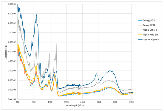 FTIR spectra of copper alginate conjugates with RGD derivatives.