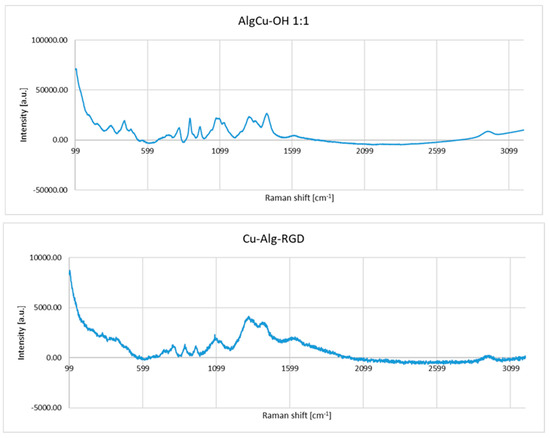 In the Raman spectra of the copper alginate conjugates with RGD derivatives (AlgCu-NH2 and AlgCu-OH) obtained by physical modification, changes in the course and intensity of the bands are visible in the range of 1180–1020 cm−1. This is the range of typical polysaccharide vibrations (C-O-C glycoside bond and sugar ring) (Figure 9), which indicates a different molar ratio of peptides applied to the polysaccharide nonwoven fabric.