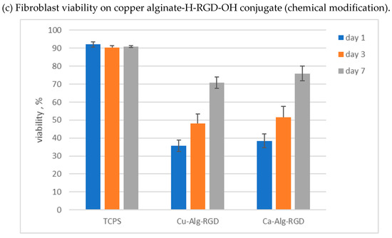It was found that copper alginate conjugates with RGD derivatives are not cytotoxic to the L929 mouse fibroblast cell line. This observation applies to all the tested materials, both the derivatives obtained as a result of the physical deposition of H-RGD-OH and H-RGD-NH2 and the material with a chemically bound RGD peptide. In the case of materials obtained as a result of physical deposition of RGD derivatives, the amount of the peptide component had no significant effect on cell survival (Figure 10a,b). Only an insignificant effect of the amount of deposited RGD derivative is seen in the case of H-RGD-OH on the first day of measurement (Figure 10a), where a higher peptide concentration increases the survival rate by 6%. This effect is not visible in the case of H-RGD-NH2 (Figure 10b), which may indicate a higher activity of a derivative with a blocked carboxyl group of the C-terminal amino acid (this observation is consistent with the literature data [57]). It is interesting to note that, in all cases, significantly lower cell survival was observed in the initial incubation phase than in the final phase. Thus, it can be postulated either that copper compounds have a greater adverse (cytotoxic) effect in the initial incubation phase, or that this effect may be caused by the alginate, as a similar result was observed for Ca-Alg-RGD (Figure 10c). The decisive effect of RGD on the elimination of the harmful influence of Cu2+ ions may be evidenced by the fact that our results are inverse to those described by Wimonwan and Pitt [44], where an increase of the cytotoxicity of copper alginate was observed during the incubation process. An additional fact confirming the effectiveness of RGD is that derivatives of both calcium alginate and copper alginate with covalently attached RGD peptide are more cytotoxic in the initial phase compared to materials with physically embedded RGD, which may indicate that it is necessary to release biologically active peptides from the polysaccharide matrix to get a positive effect of RGD. For covalently linked Cu-Alg-RGD and Ca-Alg-RGD derivatives, prior ester bond hydrolysis is necessary. More research is needed to explain the mechanism by which the cytotoxic effect on cells may be reduced, as, in terms of their high antibacterial activity, the final materials seem very interesting from the point of view of regenerative medicine.