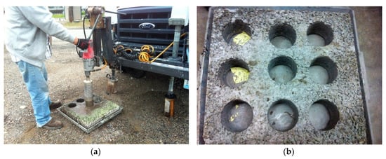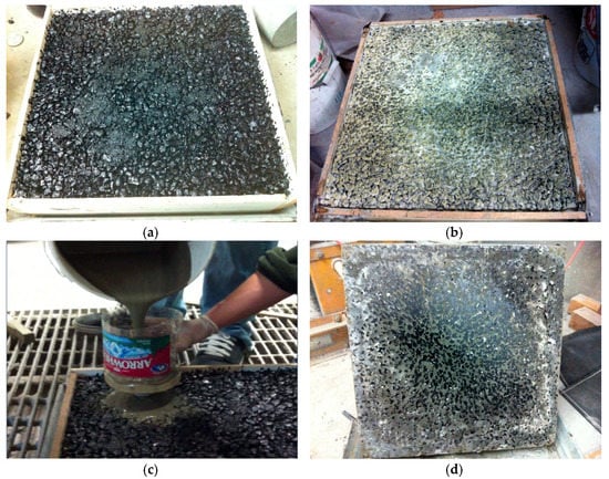 Figure 2a,b shows the asphalt mixture sample before and after filling, and Figure 2c presents cement mortar during filling. Sample mold was removed after 14 days of curing and sample bottom was well-filled with cement mortar as shown in Figure 2d.
