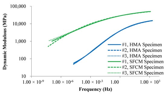 IDT dynamic modulus testing was performed using three replicate specimens. Six temperatures (−20, −10, 0, 10, 20, and 30 °C) and five frequencies (0.1, 1, 5, 10, and 20 Hz) were applied to conduct the testing and 20 °C was selected as the reference temperature when plotting master curve. Control HMA specimens were also tested using the same specimen geometry and testing conditions. The control HMA specimens were compacted in the laboratory using loose mixtures taken from the plant. Other mixture design properties include: PG70-22 binder, nominal maximal size of 19 mm, target air voids of 4%, and 100 design numbers of gyrations. It should be noted that a higher PG grade (PG70-22 vs. PG64-22) binder was used for control mixture to compare the SFCM mixture with a higher grade HMA mixture.